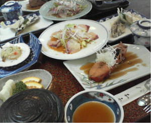 鯛のカルパッチョに赤魚の煮付け、ホタテのグラタン、きす、茄子、しその天ぷら
